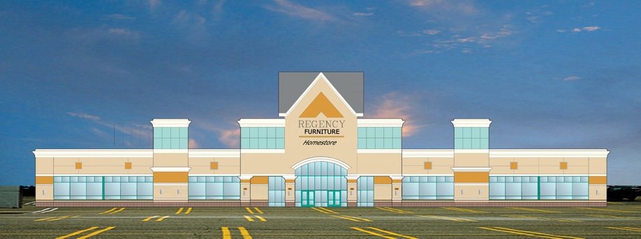 Regency furniture store, located in Fredericksburg, Virginia is a 65,000 sf facility, converted from a grocery store to a furniture retail store. It enjoys a view of a major road, and in order to take advantage of this exposure, the front of the building is designed in such a way that it will have a commanding presence and be visible from all directions. Special attention has been paid to how the building will be viewed at night; “Kalwall window system” has been incorporated at the towers and upper portions of the center of the building to emphasis the night effect.